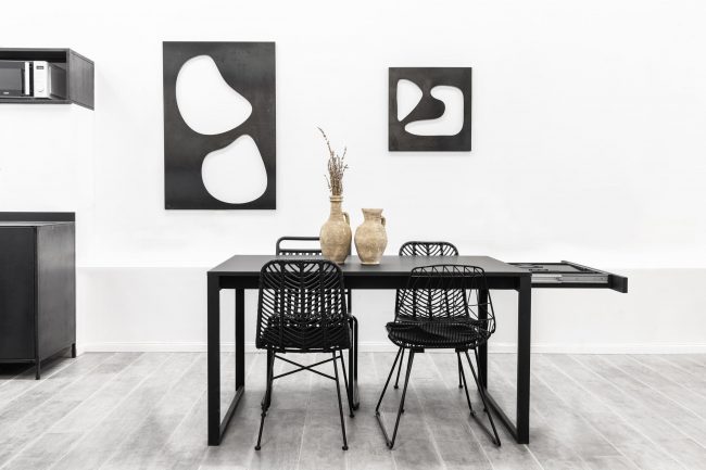 שולחן פינת אוכל נפתח המיוצר בעבודת יד. פלטה עליונה מצופה ננו – חומר באמידות גבוהה לשריטות , רגלי פרופיל ברזל במידה 50/25 מ”מ.