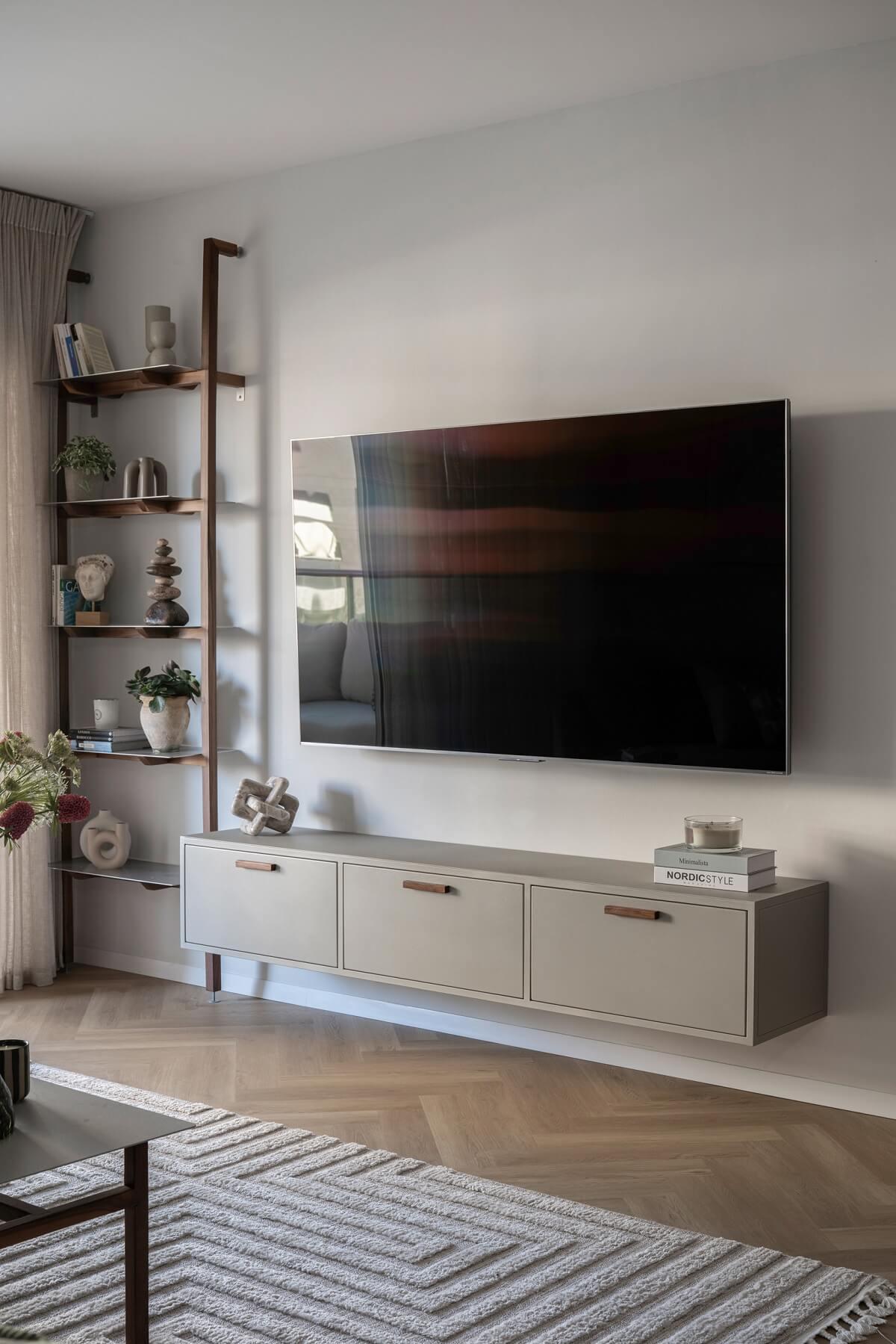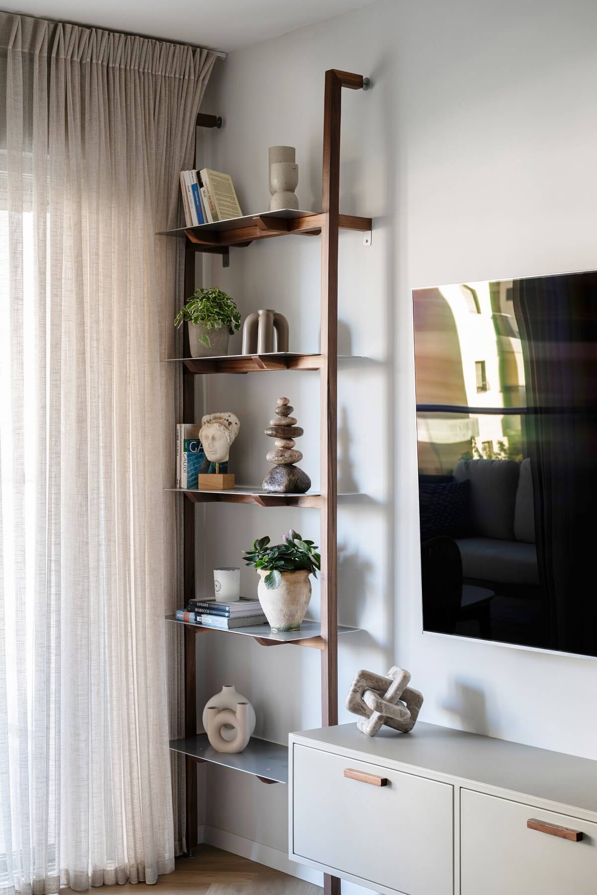 קיר טלויזיה מבית סטודיו Nooshka הוא פתרון עיצובי מקיף המשלב חומריות משובחת עם תכנון פונקציונלי חכם. היחידה כוללת מזנון מרחף בגימור צבע קפה (לאטה) מעודן, המעניק לחלל מראה נקי ומודרני, בשילוב ידיות עץ אגוז מלא המוסיפות נגיעה של חמימות ויוקרה. לצד המזנון, משולבת מערכת מידוף ייחודית המבוססת על עמודי עץ אגוז ורטיקליים ומדפי מתכת דקים, המייצרים פינה מושלמת לתצוגת פריטי אמנות, ספרים וצמחייה מבלי להעמיס על קיר הטלוויזיה.